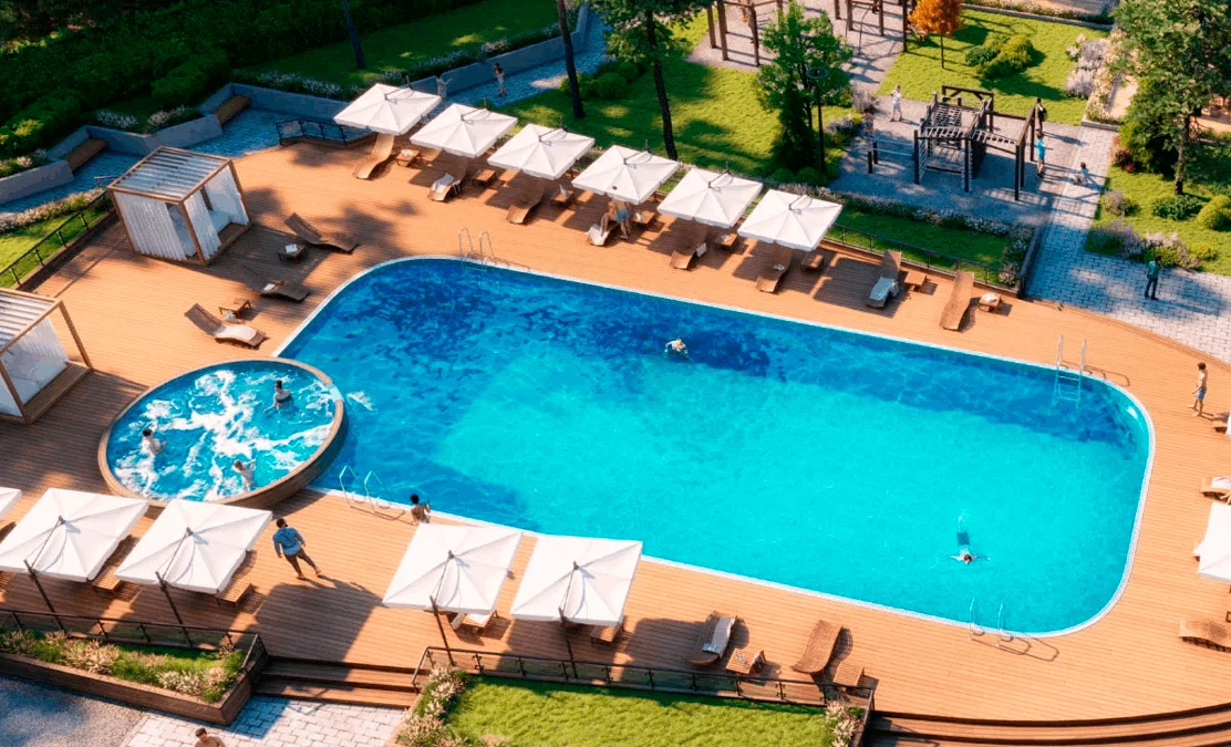Круглогодичный подогреваемый бассейн и детская чаша доступны для всех жителей резиденции.